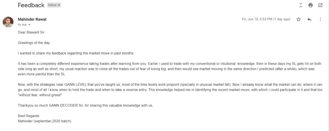 Anticipate market moves through Gann static levels and chart patterns. We rely completely on price action and do not use any indicators on chart.